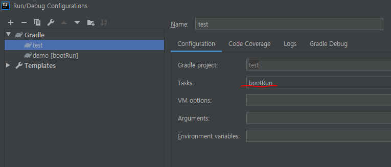 마지막으로 Run Configuration에 task를 bootRun으로 추가해줍니다.