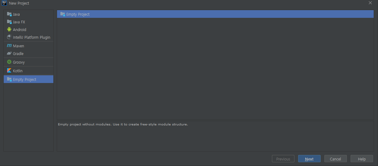 Empty Project로 생성해줍니다. 추후 다른 모듈들을 쉽게 추가하기 위해서...